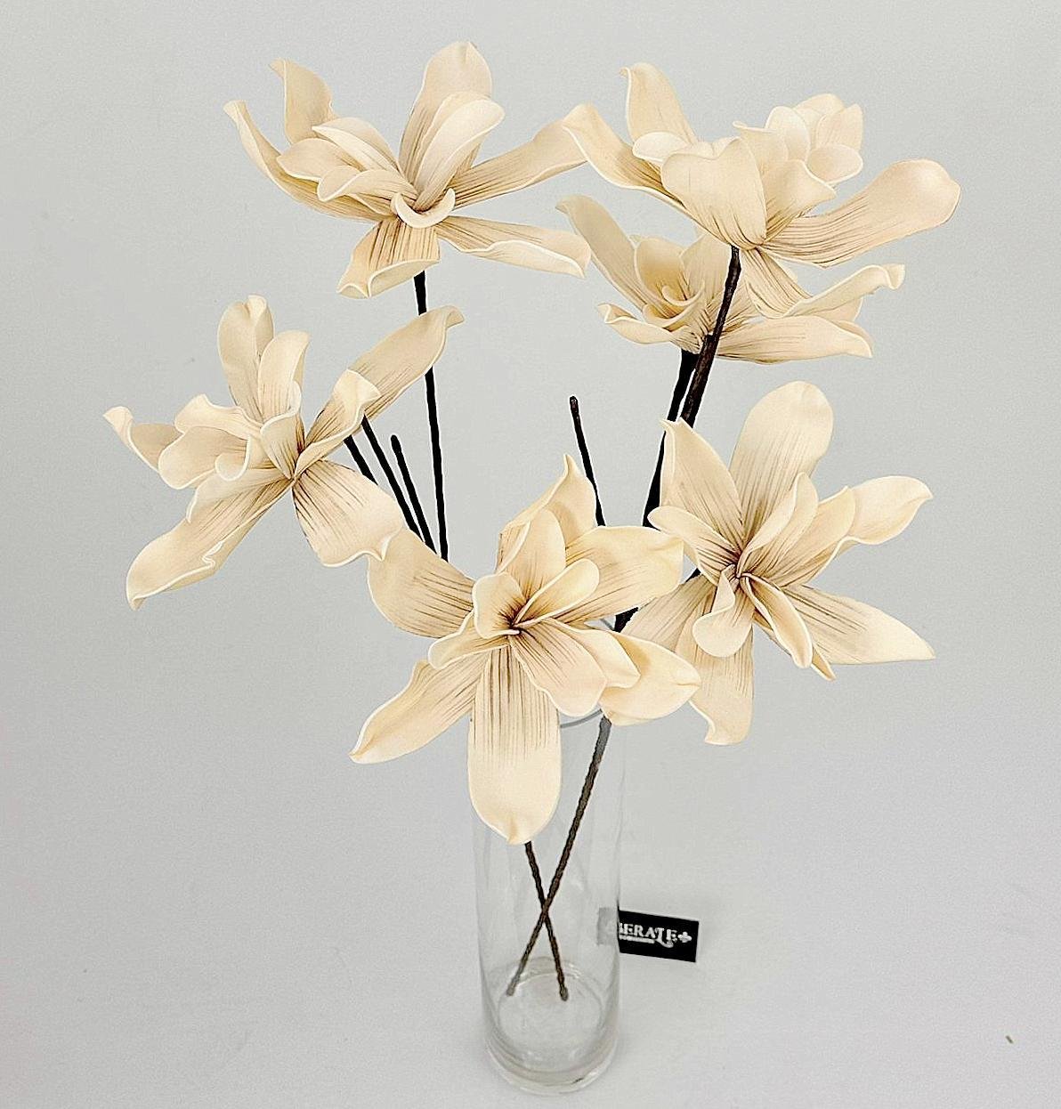 נגיעה של יוקרה נצחית. סט ענפי פרחים המדמה מגנוליה במראה אורגני ורך. הטקסטורה הטבעית והקימורים העדינים יוצרים מראה מלא ומרשים בכל חלל, ללא צורך בהשקיה או תחזוקה. (סט 6 יחידות). מידות: 95 ס"מ