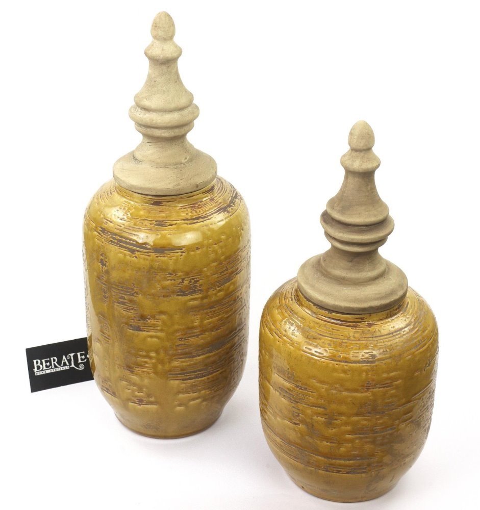 כד בסגנון עתיק, בצבע חרדל מוברש בעל מכסה גבוה מעוצב (יחידה אחת מהסט הכד הימני) מידות: 40 ס"מ