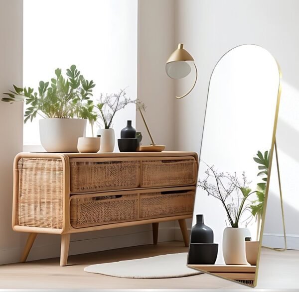 מראת קשת בצבע זהב מוברש גדולה מגיעה עם מעמד רצפתי מובנה וגם אפשרות לתלייה על הקיר