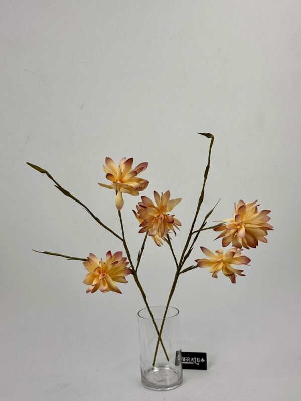 נגיעה של צבע בלב המדבר. סט ענפי פרחים המדמה את פריחת הדליה במראה אורגני ייחודי, עם קצוות בגוון סגלגל-ורוד המזכירים שקיעה מדברית. המבנה השכבתי והעדין מעניק עומק, חיוניות וסטייל יוקרתי לכל סידור אגרטל. (סט 6 יחידות). מידות: 80 ס"מ