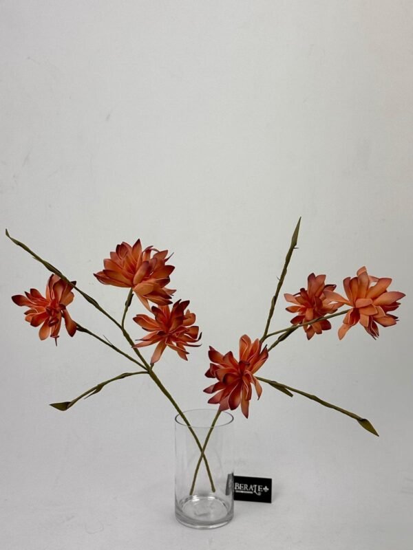 חמימות מדברית עמוקה. סט ענפי פרחים המדמה את פריחת הדליה בגוון טרקוטה עשיר ואורגני. המבנה השכבתי של עלי הכותרת והצבע הנועז מעניקים לכל אגרטל נוכחות דומיננטית, חמה ומלאת אופי, המשתלבת נפלא בעיצובים מודרניים וכפריים כאחד. (סט 6 יחידות). מידות: 80 ס"מ