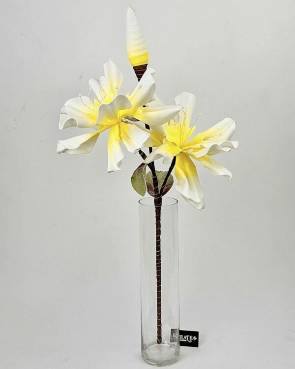 רעננות קיצית בסטייל פיסולי. סט ענפי פרחים המדמה את פריחת ההיביסקוס האקזוטית במראה אורגני וחשוף. השילוב בין הפרחים הלבנים בעלי המרכז הצהוב-לימון לניצן הזקוף מעניק לכל אגרטל מראה מאיר, מלא חיות ויוקרתי, המוסיף תחושת אור ורעננות טבעית לכל חלל. (סט 6 יחידות).