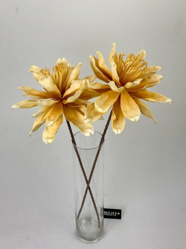 דרמה ויוקרה בסימפוניה של צבע. סט ענפי פרחים המדמה את פריחת הלוטוס המלכותי בגווני ענבר חמים ואורגניים. המבנה המלא, עלי הכותרת הגליים והמרכז העשיר באבקנים יוצרים נוכחות פיסולית עוצמתית שמעניקה חמימות וסטייל יוקרתי לכל אגרטל. (סט 6 יחידות). מידות: 80 ס"מ