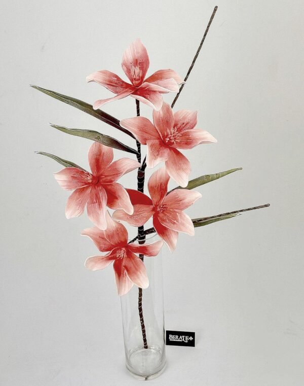 רעננות טרופית במגע אורגני. סט ענפי פרחים המדמה את פריחת הליליה האקזוטית בגוון קורל-אפרסק תוסס. הענף כולל חמישה פרחים פתוחים בעלי עלי כותרת מחודדים המשתלבים עם עלווה ירוקה ומוארכת, ליצירת מראה עשיר, צבעוני ובעל נוכחות פיסולית משמחת לכל אגרטל. (סט 6 יחידות).