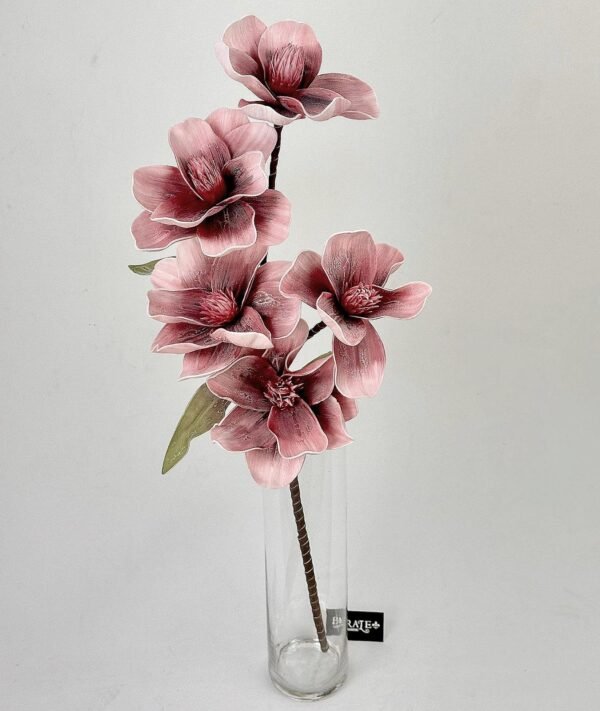 יוקרה פורחת בשיאה. סט ענפי פרחים המדמה את פריחת המגנוליה המלכותית במראה אורגני וחשוף. התפרחת המדורגת לאורך הגבעול בגוון ורוד-יין עמוק מעניקה לכל אגרטל מראה מלא, עשיר ובעל נוכחות פיסולית דומיננטית, המשלבת עדינות קלאסית עם חספוס טבעי. (סט 6 יחידות). מידות: 110 ס"מ