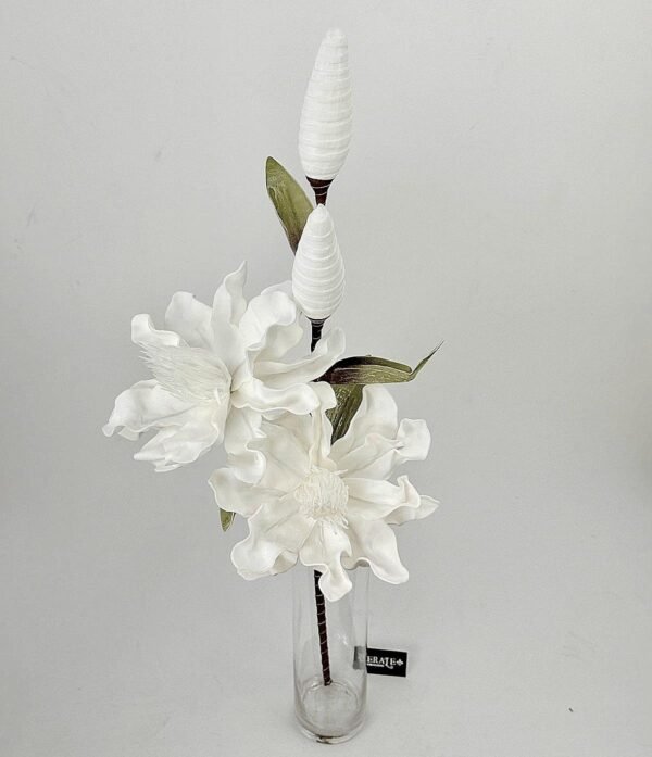 אלגנטיות מדורגת במיטבה. סט ענפי פרחים המדמה את פריחת המגנוליה הלבנה בשילוב ניצנים פיסוליים. המבנה המדורג והטקסטורה המפורטת של הפרחים והניצנים מעניקים מראה עשיר, יוקרתי ומלא נוכחות לכל חלל מודרני. (סט 6 יחידות).