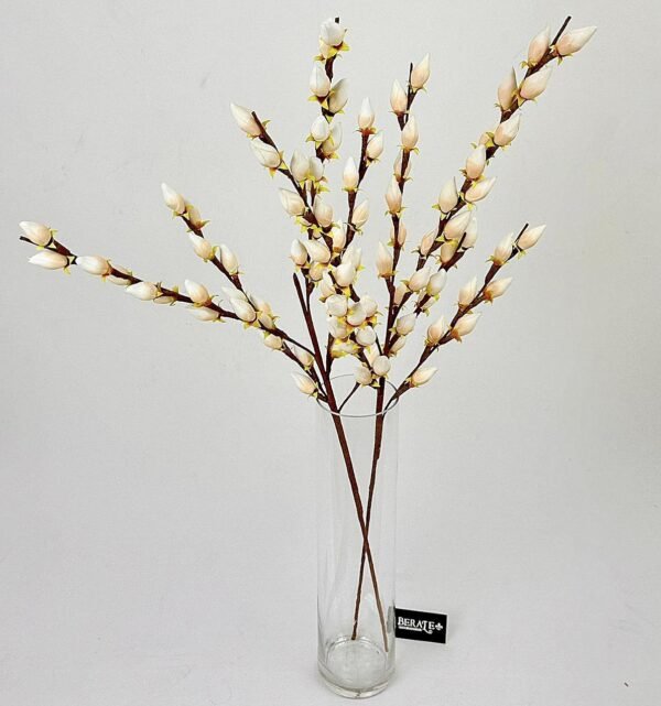 פריחה אביבית נצחית. סט ענפי פריחה עשירים המדמים את פריחת הפורסיתיה הלבנה במראה אורגני וחשוף. ריבוי הניצנים והפריסה המדורגת לאורך הגבעולים מעניקים לכל אגרטל נפח משמעותי, עדינות פיסולית ותחושת רעננות יוקרתית. (סט 6 יחידות). מידות: 110 ס"מ