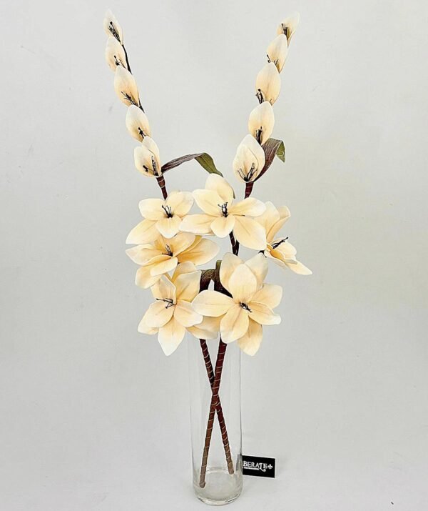 סט 6 דגם ייחודי של ענפי פריחה מלאכותיים בגווני שמנת-אפרסק, עם פרחים פתוחים בחלק התחתון וניצנים ארוכים ומדורגים בחלק העליון. המראה המשולב יוצר עושר טבעי ואלגנטי, כאילו נקטף מעץ פורח בעונת האביב.